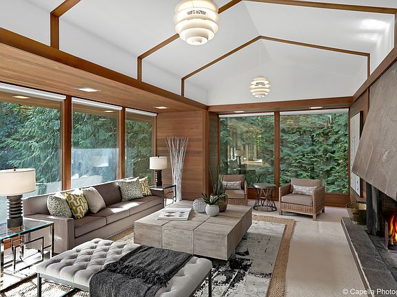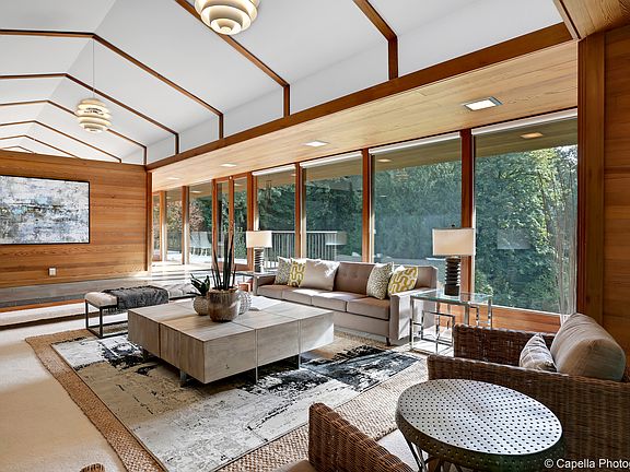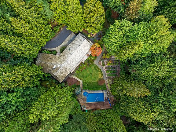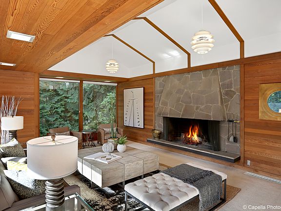 Stunning and one of a kind mid-century modern! Privately tucked away in the Marshall Park neighborhood on a 1.74 acre lot surrounded by beautiful mature trees. Spacious living, dining, and family rooms perfect for entertaining. Endless charm throughout entire home. 4th bedroom and full bath on lower level great for in-laws. Wine cellar/workshop, built-ins throughout, luxurious walk-in master closet, and much more! Exterior includes wrap-around driveway with carport, garden, greenhouse, tool shed & lawn. Also check out that pool and hot tub surrounded by a large deck! Clear cedar throuout. Floor to ceiling windows with a view of the beautiful property and pool. Frank Loyd Wright inspired design. Maple and stone floors. Triple pane new windows. Totally remodeled kitchen with clear, center cut maple cabinets, new appliances, new gas cooktop, Guggenau ovens, Sub-Zero refrigerator, and granite countertops. Remodeled baths with shower room, jet tub, and granite. 2 huge stone fireplaces, one with new wood burning insert. New wool carpets. 100 year tile roof. Lodge like setting. Long, circular driveway. Heated greenhouse. Complete privacy. 10 minutes from downtown Portland. 5 minutes from Lake Oswego. Huge new utility, laundry room. Game/tv room with fireplace and wood burning insert finished with rare barn wood and a large office in the daylight basement. This room also has huge windows with a view of the expansive, trees property and resort sized pool. new floors in the daylight basement. Huge garden with blueberries, raspberries, strawberries, and mature fruit trees.