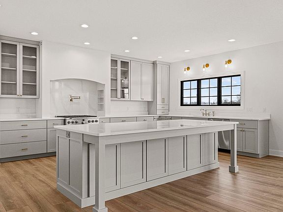 Welcome to this brand new 5 bed 5.5 bath home nestled in the desirable Homestead school district! Situated on an excellent pond lot, this 2-story home boasts a full, finished basement for the perfect amount of dedicated living areas. As you enter, you will notice natural daylight filling up the living room with a soaring 18' coffered ceiling. The 2 sided brick fireplace creates comfort on both sides! The chef's dream kitchen features a massive island with abundant storage, complemented by plenty of cabinetry & a stunning quartz backsplash with a convenient pot filler. The primary bedroom has a spacious layout and a lavish en-suite bathroom showcasing dual vanities with quartz countertops, a standalone tub, and an oversized ceramic-tiled shower. Upstairs, each of the three bedrooms comes complete with their own full bathrooms adorned with quartz countertops, walk-in closets with tamers + there is additional laundry hookups for convenience. The basement is an entertainer's delight, offering a 5th bed, a generous living area, a theater room, workout space, & a sleek wet bar with daylight windows that bring in tons of natural light. Step outside to relax on the covered stamped concrete patio or the additional patio & savor the water views that this property affords. A 4 car tandem garage provides ample storage for vehicles & recreational gear. Tons of upgrades throughout including hard surface countertops everywhere, luxury vinyl plank flooring, CAT 5 ran to each room, additional concrete patio, on demand hot water heater, dual furnaces and AC + more. Don’t miss your chance to see this one in wonderful Chestnut Creek!