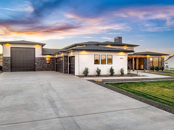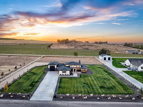 Breathtaking property situated on a pristine 2.5 acre lot with stunning panoramic views from every direction. Steps away from Lake Lowell w/ possibilities that are endless- master suite + mother-in-law suite w/ separate private entrance, 50' RV bay + build your custom dream shop & private swimming pool. Jaw dropping interior that is showcased by 16' soaring ceilings, sprawling hardwood floors, custom exposed beams, floor to ceiling stone fireplace w/ built-ins, incredible craftsmanship, picturesque windows & beautiful double sliders leading to the spacious covered patio w/ built-in BBQ. Desirable single level floor plan- nearly 3100sf w/ 4 beds (4th could be used as bonus) + split bedroom layout great for privacy. Gourmet kitchen features waterfall quartz island, Thermador appliances, ample cabinet space & walk-in pantry. Spa like master suite boasts private patio access, dual vanity, freestanding tub, floor to ceiling tiled walk-in shower, dual walk-in closets w/ hidden Murphy Door leading to laundry room.