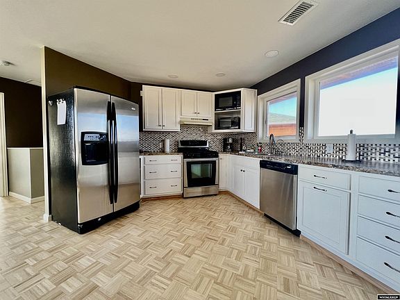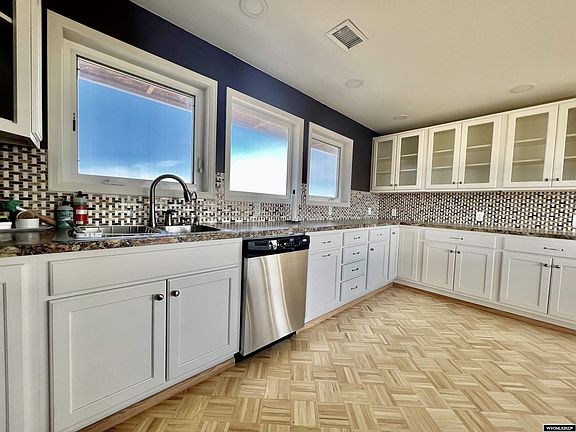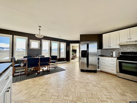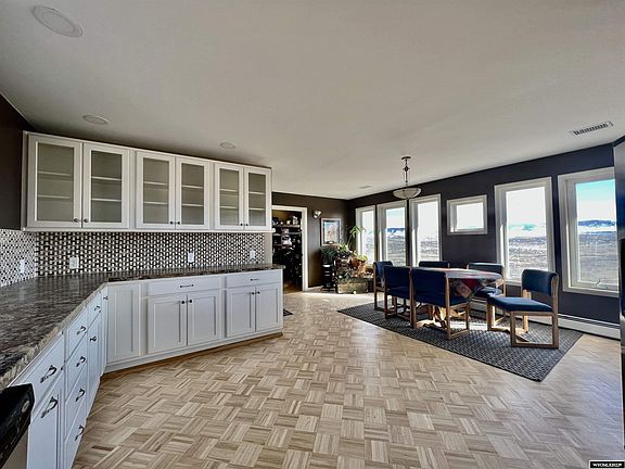 Those looking for a spacious, welcoming and comfortable home are sure to be impressed by this Casper home. Situated on a 20-acre property down a quiet road and backing onto State land, this property offers privacy and peace, while still being a short 15-minute drive from the center of town. The open-plan and updated kitchen and dining room enjoy refinished wood floors and plenty of soft natural light thanks to the large windows and doors that capture the snowy mountain views. Also on this level, you can find a spacious living room and a half-bath. Moving downstairs where the three bedrooms with newer carpet can be found, as well as two baths for convenience. Adding to the impressive list of features is the daylighted, walkout basement, a detached oversized double garage, a 2,500sqft barn and fenced horse pastures. You can ride your horse through the neighboring State forest, making this property even more appealing for those that are looking for space to move.