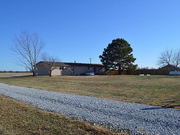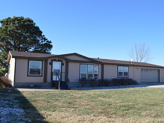 Country living at an affordable price! 3 bd, 2 ba double wide mobile home has 1,456sf & sits on .81 acre, with rural water. New carpet & paint, several new light fixtures & new vinyl flooring in kitchen, dining & utility areas. Open floor plan boasts large living area & tons of natural light. Kitchen has a great amount of storage space & a separate pantry. On demand hot water heater. Attached oversized 2 car garage with additional storage. Property is fenced with mature trees.