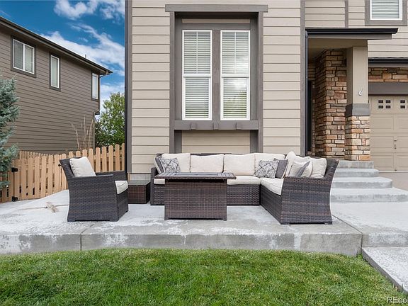 Welcome home to this beautiful 5 bedroom, 4 bath home in The Hearth, a "front porch" neighborhood where families gather in driveways and kids ride bikes and scooters throughout. Where you can walk to the parks and rec centers or hike/bike to the nearby trails. If you're looking for an incredible community this is the place! The home is light and bright with many windows and gorgeous hardwood floors. The roomy kitchen, with wood cabinetry and stainless appliances has an island, eat in nook and desk area. The kitchen opens to the dining room which is perfect for hosting. The living room features lots of windows and natural light as well as vaulted ceilings and a gas fireplace, perfect for those cold snowy Colorado nights. Upstairs, you will find the primary suite with incredible mountain views, dual walk in closets and a five piece en suite bathroom with soaking tub. Three additional bedrooms, another full bath, and built in desk with cabinets complete this level. In the fully finished basement, find a family room with kitchenette/wet bar area with sink, microwave and mini fridge, along with additional bedroom, 3/4 bath and laundry room - perfect for additional living space or mother-in-law suite. In your private, low maintenance, fully fenced back yard you will enjoy a Trex deck and mature trees. Amazing location close to Southridge Recreation Center which features a pool, tennis courts and pickleball courts. Bike in/out of Backcountry biking trails, surrounded by hiking and walking trails, steps to Rock Canyon High School and Rocky Heights Middle School and close to Paintbrush Park. Highlands Ranch is one of the nation's best master planned communities where residents have access to multiple rec centers which feature fitness facilities, tennis and pickleball courts, hundreds of miles of walking and biking trails, top rated Douglas County schools, so many dining options and more!