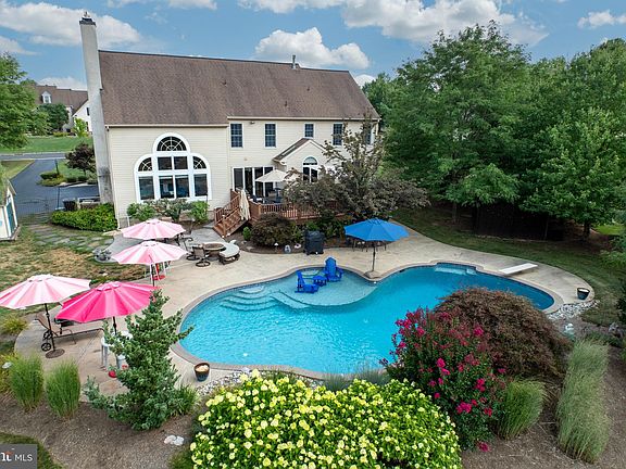 Welcome to your dream home in Skippack Township, just steps away from Palmer Park and the Perkiomen trail that leads you into the town of Skippack! This exquisite 4,198 square foot residence sits on an acre of land, offering a large backyard with an in-ground saltwater pool, creating a private retreat. As you enter through the two-story foyer, you'll be greeted by hardwood floors that extend throughout the home. To the right, there's an office with built-in cabinets and a charming barn door, complete with automated blinds for convenience. To the left, you'll find a spacious living room and dining room. The great room features a two-story ceiling, gas fireplace, a wall of windows, and a back staircase, seamlessly flowing into the open kitchen. The kitchen is a chef's delight with a gas cooktop, double ovens, a large island, stainless steel appliances, and automated blinds. The kitchen is brightened by a skylight over the sink, and large floor to ceiling double door sliders open to a deck that overlooks the pool and your private backyard retreat. Completing the main level is a powder room and a three-side entrance garage leading to the mudroom and laundry room. The finished basement is perfect for entertaining, boasting a wet bar with a concrete top, a refrigerator, kegerator with built in tap, dishwasher, beverage refrigerators, cinema lighting, a gas fireplace, dehumidifier, and plenty of space for gatherings. There's also a workout area, 2 storage closets, a half bath, and steps leading to the backyard. On the second level, you'll find four spacious bedrooms and two full baths. The primary suite is a luxurious escape, featuring a tray ceiling, a sitting area, a large walk-in closet, and a sizable bathroom with a soaking tub, a stall shower, and double sinks. This stunning home combines modern amenities with elegant design, making it the perfect place for relaxation and entertaining.