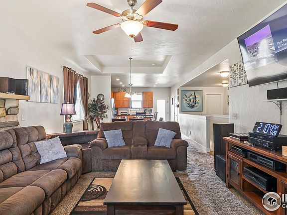 SOAK UP THE SUNRISE on the covered back patio of this one owner 3,080 SqFt home in Kiowa Park. Located within an hour from DIA, 30 minutes to Jackson Lake, the community includes a nearby playground and walking trail with small town vibes. The home features upgrades such as a stone surround gas fireplace, stone countertops, wood floors, gas range/oven, tile in bathrooms, wash sink in the laundry, blinds, 9' ceiling in the unfinished basement with potential for 2 more bedrooms and bath rough-in. Enjoy main level amenities, an open living area, kitchen island with seating, pantry, spacious primary bedroom- vaulted ceilings, double sinks, a large shower with bench seat PLUS fiber optic internet. The yard is complete with a sprinkler system front & back, privacy fenced back yard and East facing patio that overlooks open space with a view for the local 4th of July fireworks display. Seller concessions are negotiable, a Silver 14 Month Blue Ribbon Home Warranty is offered to a buyer at closing + option for assumable VA loan!