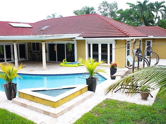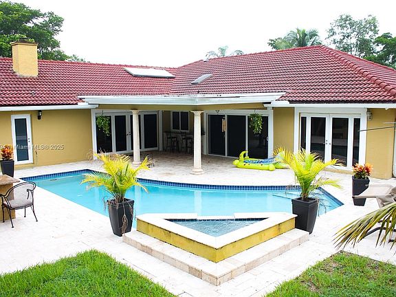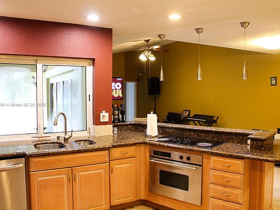 Luxury, comfort, and functionality. Step into the oversized master suite featuring a spa-like bathroom with a supersized shower, ceiling-mounted rainfall system, soaking tub, and a custom-designed walk-in closet with divided sections for maximum organization. The home is secured with impact windows and doors, and the spacious kitchen is built for gathering—complete with a large counter bar that invites family and friends to come together. Enjoy the beautifully designed backyard oasis with a sparkling pool, waterfall feature, and serene waterfront views. Feel the refreshing breeze as you relax outdoors, or fire up the built-in brick pizza oven for the ultimate entertaining experience. Granite countertops throughout add the perfect finishing touch to this already impressive home.
