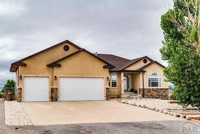 You'll love this charming rancher situated on just over an acre with spectacular panoramic views of the mountain range. What a spacious and open floor plan in this 3 bed, 2 bath home with a 3 car garage. Over 2,000 sqft of generous space to move about (with another 2,000 sqft in the walkout basement to finish and make your own design). This semi custom home built by Mallard Construction includes *9ft ceilings *split master floor plan *tile floors *granite counters in the kitchen *stainless steel appliances *butler pantry *formal dining room *gas fireplace *main level laundry *unfinished basement *landscaped *covered deck *new roof and gutters *new exterior paint. All of this, and just minutes away from Lake Pueblo.