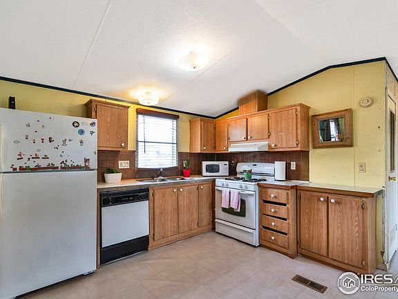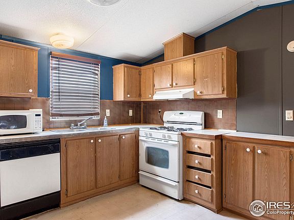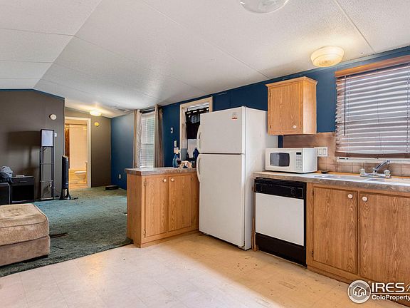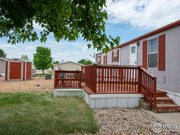 Single Wide home in Firestone's Eagle Crest Manufactured home park. Conveniently located close to I-25, stores, restaurants, grocery and lots of trails. Quiet street in clean friendly neighborhood. 2 bedrooms and 2 full bathrooms. New paint, newer skirting, newer hot water heater. Large lot with shed and fire pit, great for watching the sunsets and the beautiful mountain views. Open floor plan flows into the kitchen and dining area. 3 off street parking spots. Community includes Pool, Parks, Trails, Clubhouse, Snow removal. Pets allowed. Lot rent only $740. Lender Financing is available*Must be approved through community prior to closing*