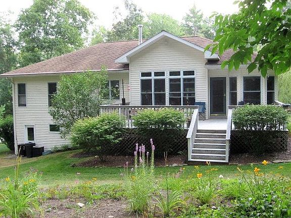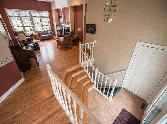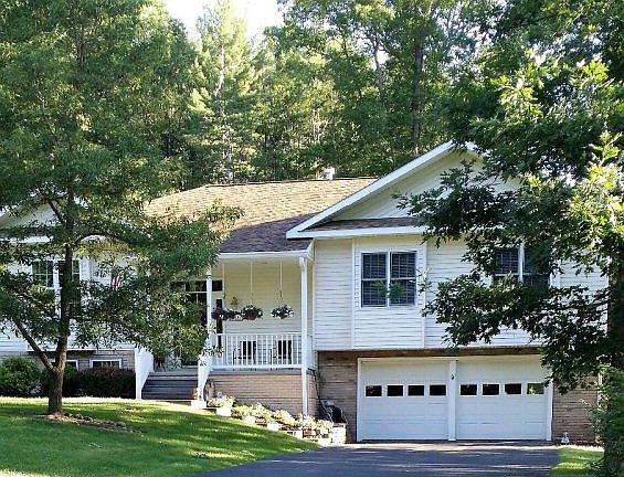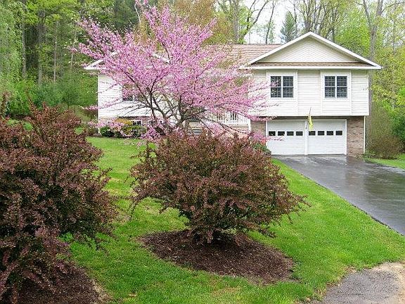 Looking for a quiet, private, wooded setting close to Corning, look no further. The original owners have taken great pride in this home. Featuring high ceilings & lrg windows, there is an abundance of natural light, complimented by the new HDWD Flrs throughout the open dining rm & living area w/built-in gas FP. Main floor includes a large master suite w/Jacuzzi tub, two addl BRs, laundry rm & plenty of storage throughout. Large Trex deck overlooks the secluded woods. Finished full bsmt for addl space, 2 car gar is extra deep could use as a workshop, home warranty incl. Home is move-in ready!