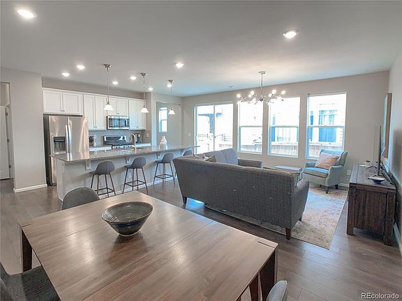 This immaculate paired home in Stapleton features a covered front porch with mountain views. The open concept main floor includes a kitchen with granite counters, glass backsplash, gas range, stainless steel appliances, walk-in pantry and opens up to the living and dining areas. There is also a large kitchen island that provides plenty of space for entertaining friends and family. The side yard and patio provides additional space for grilling, relaxing, and entertaining; includes a Trex deck, stone patio and turf area. The home also features 3 bedrooms, 4 bathrooms, loft, and laundry room. The master bedroom includes a walk-in closet and private bathroom with a soaking tub and shower. The second bedroom is located across from another full bathroom. The finished basement has a large family room, bathroom, bedroom, and a storage room. This home also includes a 2-car garage with extra space for storage. The neighborhood has quick access to I-70, I-225, and Denver International airport, and is also conveniently located near many local neighborhood shops and restaurants including Stanley Marketplace. Check out the virtual tour to get a full experience of what this home has to offer.