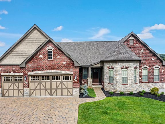 CALL RODNEY WALLNER FOR MORE INFO! 314-250-5050 ROCKWOOD SCHOOL DISTRICT! Professional landscaping, beautiful brick & stone elevation, covered porch & turret along with custom stone paver driveway & 3 car garage give this custom built display excellent curb appeal. As you enter this home you will notice that it offers every upgrade imaginable. Hand-scraped hardwood flooring spans the spacious open floor plan of this 3 bedroom, 2.5 bath home. Vaulted ceiling, tons of can lights, Heatilator direct vent gas fireplace with stone masonry surround, built in shelving and a beautiful view complete the open great room. The kitchen features custom white 42" cabinetry with an additional display cabinetry & crown molding above, granite counters, built in stainless steel appliances, complimenting subway tile back splash & center island/breakfast bar. The adjoining breakfast area offers convenient access to the composite deck overlooking the beautiful subdivision below. The master bedroom suite includes a wall of windows, coffered ceiling, walk in closet and luxurious master bath with granite vanity tops and custom tile shower! Additional amenities include zoned heating and cooling system, main floor laundry, built in cubbies & walk out lower level with access to a large custom paver stone patio & much more!! View this move in ready home today!