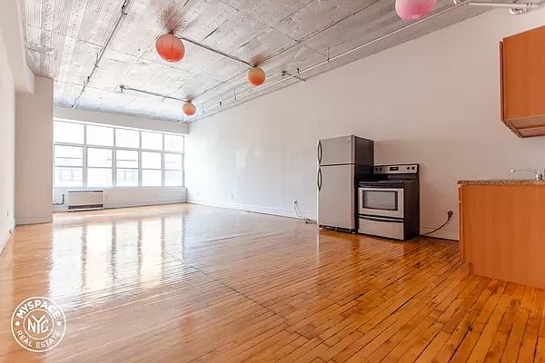 Incredible open loft! Real loft living. One-of-a-kind building with Kava Cafe, laundry, food co-op, shipping center, yoga studio, courtyard, and freight elevator. Converted yarn factory with tons of original details throughout the building. Professional property management and well maintained building. Wide open loft with entire wall of windows! Hardwood floors, tin ceilings, and renovated kitchen and bathroom. High ceilings for the true loft vibe. No broker fee!