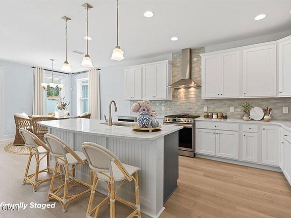 NOW COMPLETE in the Breakfast Point East community, the Crevalle plan from Fischer Homes is a spacious, open-concept design with 2,255 square feet of conditioned living space and a craftsman style exterior elevation. Upgrades were added to this 4 bedroom, 3 full size bath, 2-car garage home with a 10'x20'8'' covered back porch. The wide open living room, dining room, and kitchen area is filled with natural light and provides plenty of space to entertain. Luxury kitchen finishes include a large island, quartz countertops throughout the home, white shaker style cabinetry including a coastal blue accented island, and Frigidaire® Gallery stainless steel appliances including a stainless steel vent hood and upgraded backsplash. Additional features of this home include luxury vinyl plank flooring in main living areas and bedrooms (photos depict carpet, but will be changing), high grade carpet, tile flooring in bathrooms, low profile LED lighting, 8' 2-panel craftsman interior doors, architectural shingle roof with 30-year warranty, and a gas stub for a grill. All new Breakfast Point East homes are designed to withstand up to 160MPH winds with structural steel framing.