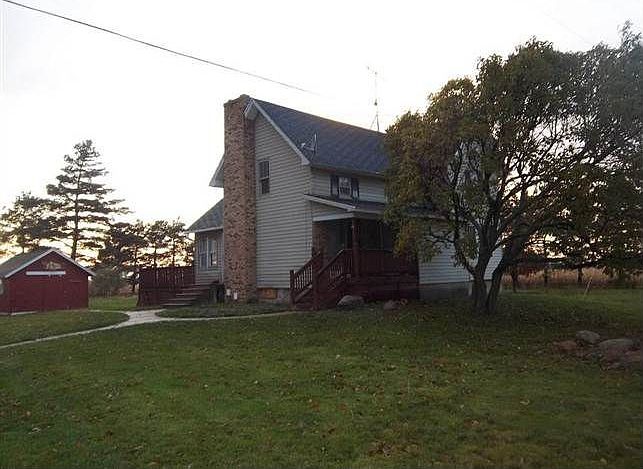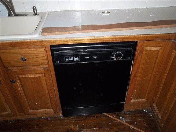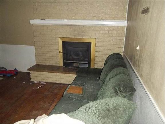 Exterior Features: Aluminum siding, foundation is stone/poured cement. Windows intact. There are soffits present, few eaves are present but in need of repair. Shingled roof, cement driveway. Three outbuildings, back deck present. Front covered porch. No garage. House is in poor condition. Interior Features: This is a 4 bedroom, 2 bath home in the country. One bathroom on each level. Living room and dining room are present. Kitchen with dishwasher, sink, cupboards present. Basement with water heater and furnace present. Replace all flooring. Clutter throughout home as seen in photos.