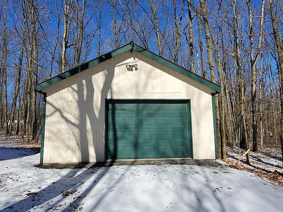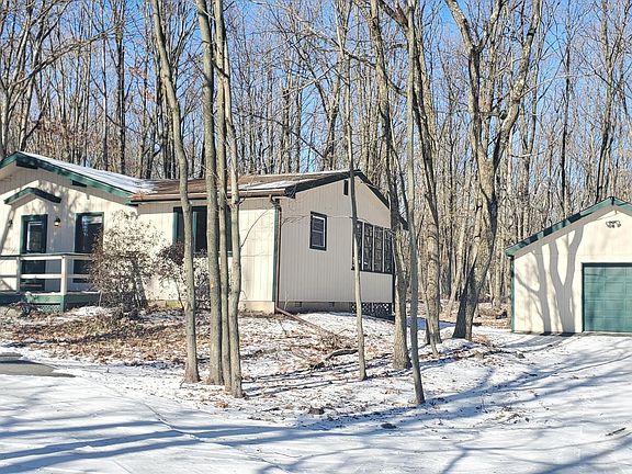 Cozy Adorable 2 Bedroom Ranch located within the desirable Pleasant Valley School District. Property is set back on a 1 acre wooded lot located in Low dues community offering pool and tennis courts. Close to all Pocono attractions. Features include Sunroom, Fireplace, Large Dining Room, paved driveway with plenty of parking and a large 2 Car Detached Garage with a fenced in back yard.