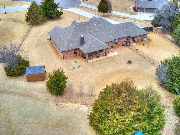 Edmond schools! 4 CAR GARAGE! Arched doorways & tray ceilings adorn this amazing home w/ 4 bedrooms,3 baths,AND a Study! You will love this open floor plan living area w/ its gas log fireplace & tray ceiling. Expansive dining area is just off patio & great for entertaining!The kitchen offers lots of granite workspace, corner pantry,& stainless steel appliances including a gas range & new microwave. The oversized Master bedroom is light & bright & HUGE in size! The gorgeous spa-like ensuite has his & her vanities, corner jetted tub and walk-in shower. The master closet w/ 3 tiers of hanging storage conveniently adjoins the laundry room. Guest bedrooms are large and have spacious closets. The Scenic back yard is partially fenced and perfect for pets.Plenty of storage and both garages have floored attic space. Security system, whole home water filtration system, french drains, fully guttered & has great storage shed! Man Cave Garage has 220, cable & air! ASK ABOUT 100% Financing!