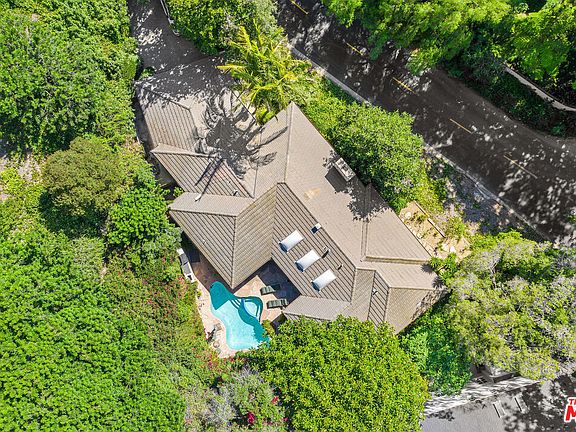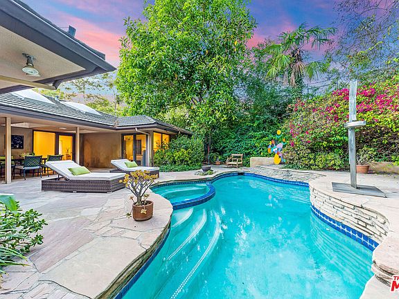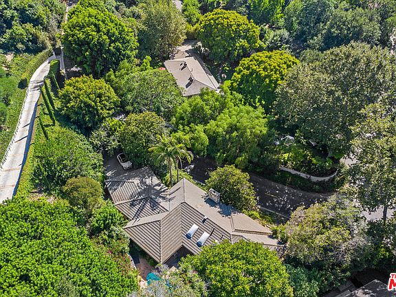 One-story mid-century home offers total privacy in Bel Air's best neighborhood just 3/4 mile from UCLA. The home is designed for entertaining. The living room, master bedroom, dining room and kitchen all open onto a covered patio with sparkling oval blue pool and spa surrounded by lush plantings of bougainvillea. The gourmet cook's kitchen has granite counters, double ovens, a six-burner gas cook top, microwave and two dishwashers. The eating area in the kitchen overlooks the pool and bar-b-q area. Each bedroom has a private bath with spacious showers. 3rd bedroom has custom built ins. This is a perfect "at home office". There is an attached two-car garage. A true find!