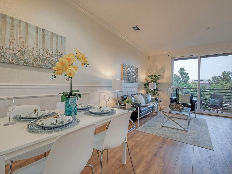 Light and bright coveted top floor home with unexpected finishes and quality including intricate wainscoting, two contemporary-updated full baths, granite countertops and more. Completely updated open-concept kitchen with stainless steel oven and dishwasher. Master suite enjoys a large walk-in closet and attached updated bath. All hard surface flooring throughout, recessed lighting, stackable in-unit laundry, plus no neighbors above the unit. Great location- on the boarder of Oakland and San Leandro allows for close proximity to nearby restaurants, shopping, and quick commuter access to HWY 580.