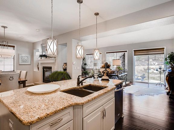 Picture perfect, pristine and eye-popping. Spacious, beautifully-kept home in The Hearth with upgrades throughout. Stroll into your high-end, custom, gourmet kitchen then enjoy a cup of coffee next to the double-sided fireplace in the dining room or the living room. Great entertaining space with a built-in bar and in-wall surround sound system for movie night or the big game. The family room is light & bright with vaulted ceilings. Take the party outside to your beautifully landscaped backyard with stamped concrete patio. On a warm day, you can still use the backyard and block the sun's rays with a retractable awning controlled by remote. Your private master bedroom with a large and well-organized closet await you at the end of your day; take a soak in the large tub to rejuvenate. With a 2 year-old high impact roof you are ready to move right in and not worry about anything. Everything in this home has been done to the highest quality level. The best maintained home in Highlands Ranch!
