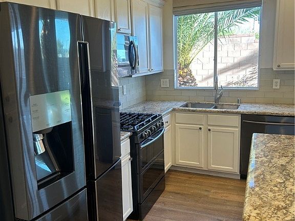 Welcome to this stunning Summerlin beauty located inthe gated community of Marbella Ridge. This home boasts 4 spacious bedrooms and 2.5 well-appointed bathrooms. The kitchen is a chef's dream with stainless steel appliances, granite countertops, an expansive island, and extended custom cabinets. The upgraded laminate flooring downstairs adds a touch of elegance and durability. Step outside to a private yard featuring a patio perfect for entertaining, low maintenance landscaping, and synthetic grass for year-round greenery. The front courtyard adds an extra outdoor space to enjoy. Experience the perfect blend of luxury and comfort in this exquisite home. Schools, parks, freeway, shopping and dining near by.