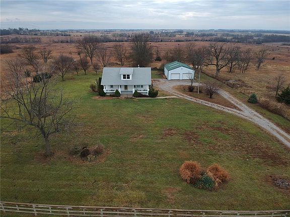 Charming and well maintained bungalow with 3 bedrooms 1bath on 20 ac. Fantastic view out of very window. You can see for 10 miles to the west, with spectacular sunsets in the evening. Home has large eat-in kitchen, with access to private composite deck. The metal out building/shop, has a concrete floor and electricity. This home has very easy & quick access to 69 Hwy for easy commute or shopping in Louisburg or Overland Park. The house and 20 ac is in the process of getting county approval to split off from larger tract of land. More acreage available. Inter Net with KWIKOM COMMUNICATION, has 25 mega bits per/sec downloads & 4 mega bids per/sec upload.
