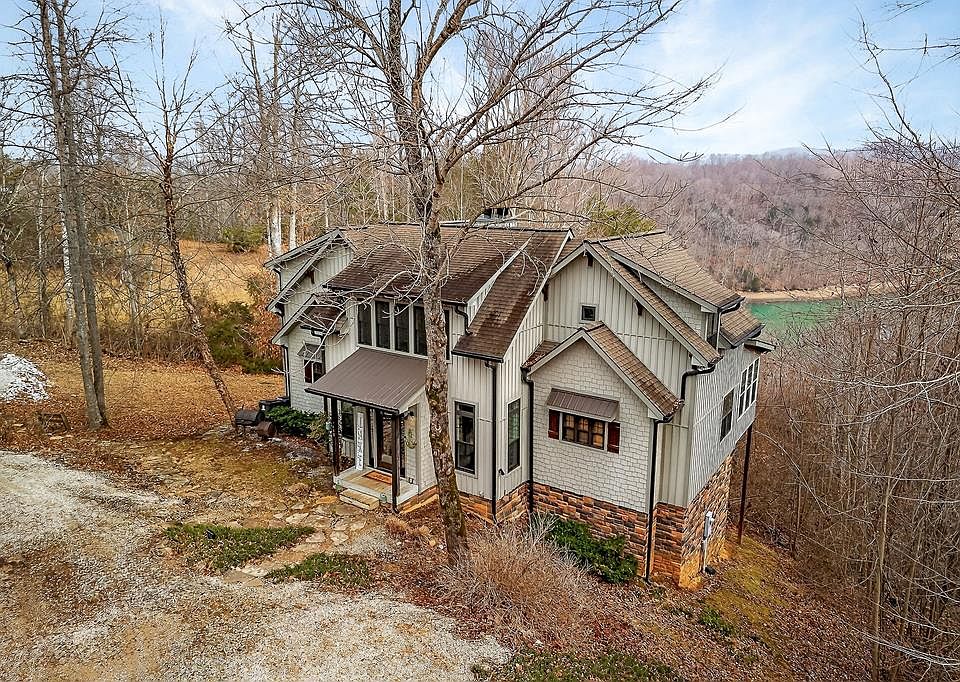 This home overlooks The Beautiful Dale Hollow Lake. Coming to you fully furnished, it is already successfully set up on short term rental programs. This home boasts three strategically placed bedrooms, and two bathrooms. Centered in the home is the living room featuring a fireplace and soaring ceilings! To the right is an aesthetic staircase leading to a loft style bedroom. Another bedroom above the breakfast nook boasts its own covered balcony featuring its own lake views. Located on the main level, is the master suite with soaring ceilings and an office/sunroom with its own exterior exit leading out to the back deck. This outdoor space has its own covered deck with a fireplace, hot tub, outdoor shower and TV-perfect for soaking in views or entertaining guests. The views are breathtaking and the possibilities are endless with this investment. Located three miles from HWY 111 and Less than 10 minutes from Sunset Marina-this property has views without sacrificing a convenient location.
