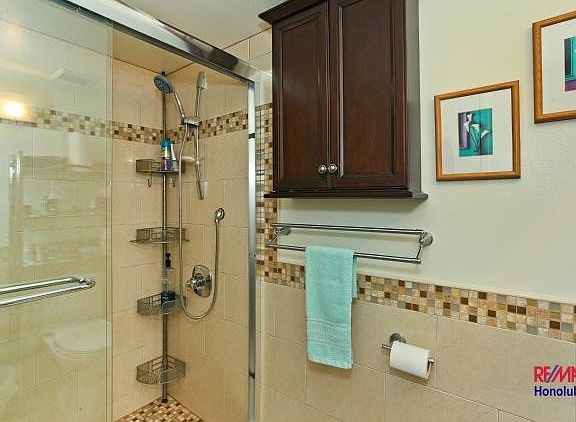 Gorgeously remodeled and lovingly maintained home offers expansive views of the Honolulu skyline. This split level home features a spacious master bedroom and sunken living area with over 300 sf of open lanai space for entertaining. Upgrades include travetine marble bathrooms with ceramic tile walls and beautiful glass tiles,contemporary light fixtures, plush carpets, newer stove, refrig and energy efficient front load washer/dryer. Split AC in bdrm and living room and high ceilings keep the unit cool year round. Heated swimming pool & whirlpool for unwinding are located just steps away!