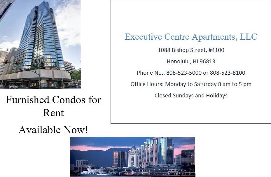 Executive Centre is located in Downtown Honolulu's Business District. Walking distance to various shops and eateries, Hawaii Pacific University, Queen's Hospital, major transportation routes. Amenities: 24/7 Security and emergency repairs, Swimming Pool, Jacuzzi, Club Room. Available Now! Minimum 6 month lease, 1 year preferred. Security deposit equals to one month's rent.