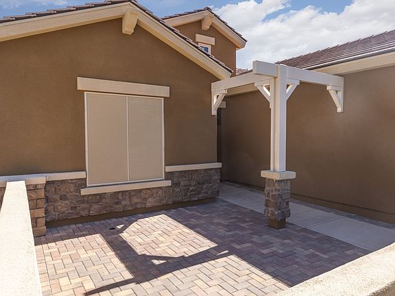 Upgraded Sun City Mesquite home with an open floor plan. This model will bring you two bedrooms, one den and two bathrooms. You will find many great features and upgrades. The great sized front courtyard is the first thing you will notice. The front courtyard has beautiful pavers and a great mesa view facing West with sunset views. As you step into this home you will notice recently painted walls, great wood like tile flooring throughout and plantation shutters on every window. Granite counter tops, matching backsplash, maple cabinets & a reverse osmosis system will be found in the kitchen. Primary bedroom has a large tile walk-in shower, custom vertical cabinets installed from floor to ceiling & a large walk in closet. This home has a convenient nest thermostat that will stay. In the garage you will find extra cabinets for storage and a water softener system. Relax in your well landscaped backyard perfect for privacy. The owner took the expense and has extended the patio with pavers and has installed two pergola extensions. This backyard is fully fenced with an outside garbage can storage area. Come see this home for yourself!