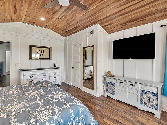 Upstairs, the private suite offers a loft-style sitting area that leads into a spacious, compartmentalized bathroom with two separate vanities, a tub/shower combo, and an additional walk-in shower. The primary bedroom showcases expansive water views and offers plenty of room for a desk, seating area, or reading nook. Interior finishes shine throughout with wood ceiling treatments, neutral paint tones, accent walls, and stunning flooring.
