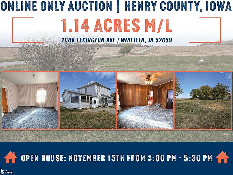 Pleased to bring to you this 1.14 Acre acreage nestled in the countryside between Olds, IA & Winfield, IA. This Online Only Auction will end November 27th at 5:00PM. If your heart is telling you, it's time to move to the country, this could be the perfect place for you. The home is 1,568 Sq. Ft. including 4 bedrooms and 1-bathroom, central air conditioning & furnace. There was a new tin roof put on the house in 2017 & new foundation poured in 1963. The large yard features multiple spots to put a garden, detached garage or outbuilding for a little livestock. With diverse acreages in high demand don't miss this opportunity in Henry County, IA. Dwellings will be sold "As Is, Where Is." The buyer will be responsible for the cost of any improvement, replacement, or repairs to the current septic/wastewater treatment system. The buyer will be required to sign a binding agreement with Henry County at Closing as part of the "Time of Transfer" requirement with the Ground Water Hazard Statement. This is an acknowledgment by the Buyer to either vacate/demolish or improve/update the current septic system per Iowa Law. Contact Agent for further details. There is an Access Easement as seen in the Survey as an attachment to use the current driveway to access the current homes paved driveway. A new owner could install a new driveway on the west side of the house along Lexington Avenue if they would like. Visit our website for more information on this Online Only Auction!