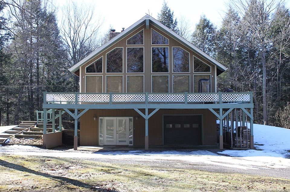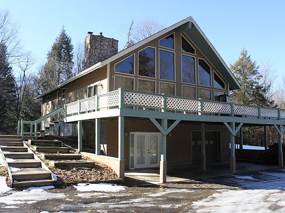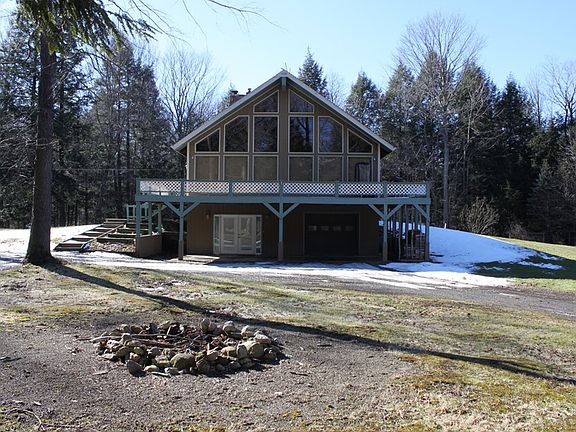 Secluded chalet nestled back in on Maxon Road! A real beauty featuring 3 beds, 2 full baths, lofted master. Great room with cathedral ceilings, all open kitchen w/walk-in pantry, dining and living with wood fireplace. Huge windows overlook awesome front deck. New furnace, new central air and new water system. Property boasts 30 acres with woods, spring fed bass pond, 2 bay attached garage plus 30x36 outbuilding and a gas well! Incredible privacy here, do not miss out.
