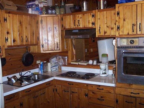 Facing West is this Full Log Chalet with many out buildings & garages. Ponderosa Pine Logs, Cedar Cabinets, Field Stone Wood burning fireplace. Owner built this cabin in the woods to enjoy nature that abounds. OWNER IS A WOOD CRAFTSMAN, as you can see by the wooden vehicles he has built. Being widowed for many years, you can see the home needs the woman's touch. All this on a dead end road. Tranquility at it's finest. Call agent for many more pictures.