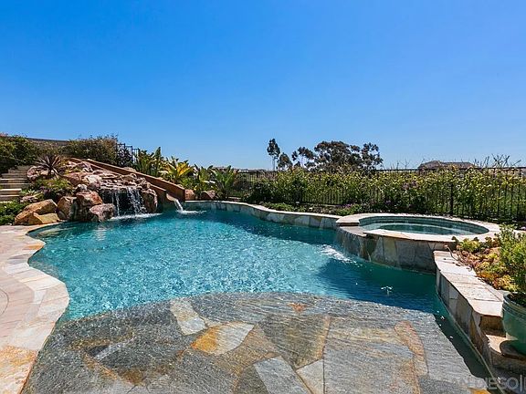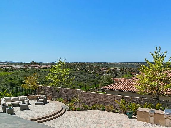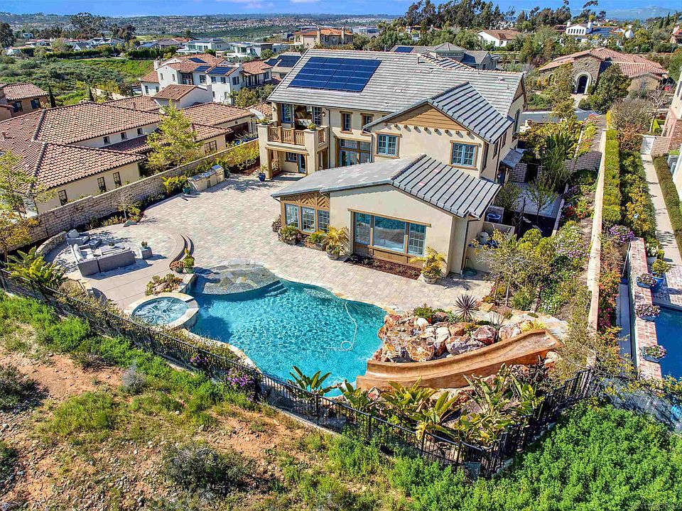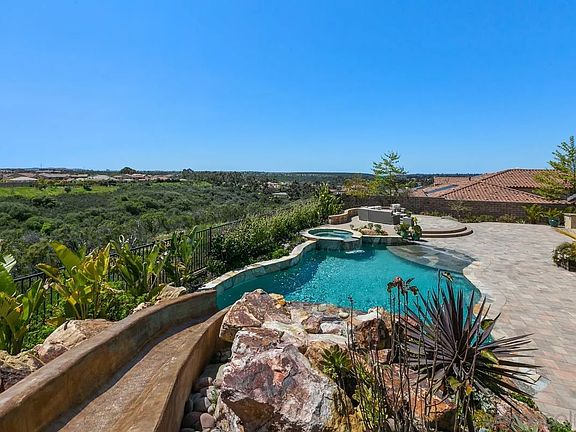 Preeminently positioned amidst exquisite architecture and world-class amenities, this home features a magnificent, oversized entertainer’s backyard with saltwater pool with slide, and BBQ area. Whether you're relaxing in the sun or hosting a pool party, this outdoor oasis is sure to impress. Situated in a prime location with breathtaking ocean and canyon views, this property offers the ultimate in luxury living. As you enter the grand entrance, you will be greeted by the elegant and inviting atmosphere that sets the tone for the entire home. The open floor plan seamlessly flows from the living room to the dining area and into the gourmet kitchen, making it perfect for entertaining and everyday living. Custom fixtures, beautiful floors, so many elements of beauty, and high-end upgrades throughout this estate! Inside, you'll find a main floor suite with a bathroom, providing a private retreat for guests or family members. Additionally, the home is equipped with solar, ensuring that you can enjoy all the amenities without worrying about high energy bills. This home truly has it all, from the stunning views to the luxurious amenities. Don't miss the opportunity to make it yours and experience the ultimate in California living.