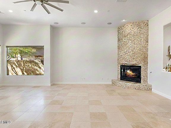 Inside, soaring ceilings enhance the spacious Great Room, which features a custom stone fireplace, travertine floors, and a 3-zone surround sound speaker system. The kitchen boasts granite slab countertops, a stylish tile backsplash, a gas cooktop, a wine cooler, and convenient breakfast bar. Surrounded by stone-accented architecture and manicured desert landscaping, this home offers both elegance and tranquility. Residents of this private gated community enjoy access to a pool and spa, set within a serene desert and boulder backdrop. Explore the scenic trails that wind through the surrounding neighborhoods, offering stunning views of the Sonoran Desert, Troon Mountain, Pinnacle Peak, and the McDowell Mountains.