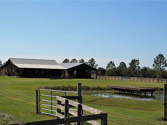 One of a kind! This magnificent property offers a peaceful, open concept 3/2 ranch style home with stacked stone wood burning fireplace on 20 acres and is surrounded by a privately owned 7,000-acre tract of land allowing for an abundance of wildlife from deer to sandhill cranes to a rare glimpse of an elusive bobcat or panther, creating a picturesque and serene retreat. The well-maintained stocked pond with a 10' x 38" wood dock greets you at the front of the property. It is fenced and cross fenced, with a cow pen and current grazing lease, allowing for a greenbelt exemption. The oversized 36' x 48' pole barn with poured concrete slab allows for plenty of parking for your tractors, cars, and other play toys. And with the cleared, open agricultural pasture, you have plenty of room to build a barn for your horses, and/or other farm animals. Enjoy a magical sunrise over hundreds of acres to the East. This is truly a rare find!