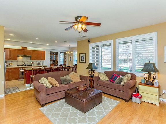 Click for Virtual Tour. Price Reduced! Beautifully, well maintained gated home in the very desirable Creekside neighborhood of the Quail Lakes Community off of Ashlan Ave. Enjoy the high ceilings, the warmth of the surroundings that includes beautiful stained glass windows, wood laminate flooring throughout the downstairs & views of a courtyard accessible from the living room, hallway & great room. Entertain family & friends in the open concept kitchen w/double ovens, built-in five burners gas stove, microwave plus an eating area, island, butler's pantry for extra prepping area and storage plus a separate formal dining room. The added office/bonus room off the kitchen will delight the at home worker or anyone that has a hobby & needs the extra space. The master suite is complete w/a large walk in closet plus master bathroom consisting of two separate sinks, soaking tub and shower. Rear backyard w/large covered patio for outdoor enjoyment. Great 3 car tandem garage too!