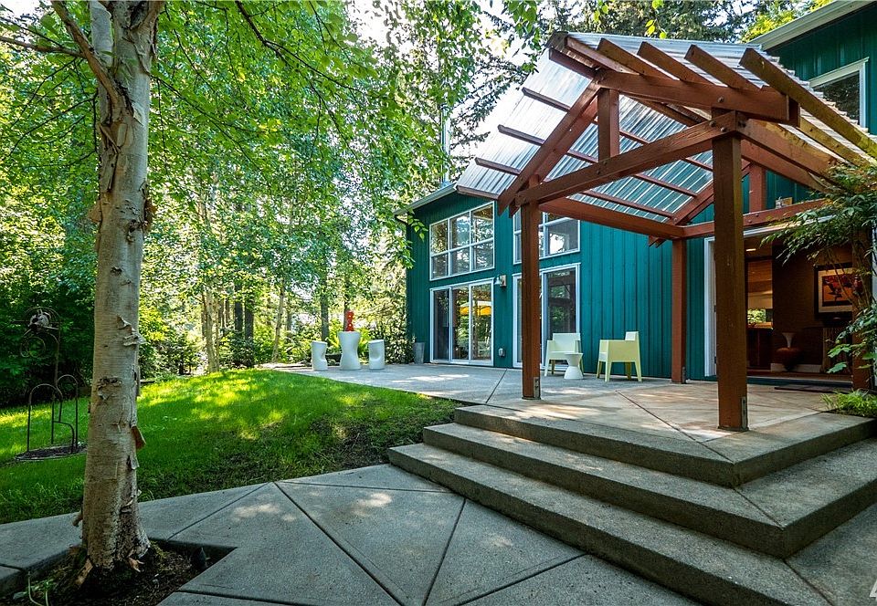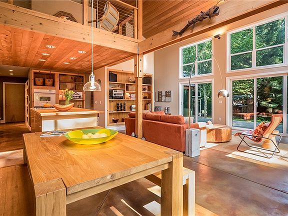 Lush & whimsical this unique architctural home beckons you. Conveniently tucked away near charming Rolling Bay, this home provides award winning landscaping complete with waterfalls, bridge boardwalk in the woodland spirit of Bainbridge Island. Expansive two story windows with soaring ceilings flood the open floor plan with light. radiant heated concrete floors, contemporary custom kitchen, huge butcher block island. Bonus space over garage.