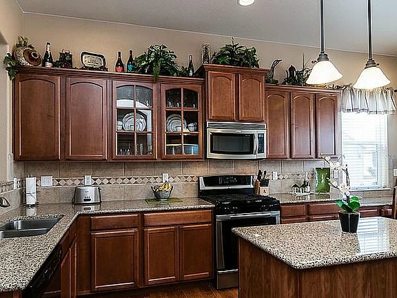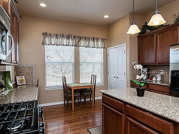 The perfect answer for a growing family! Situated in The Hearth neighborhood, this 5 bedroom home offers both space and amenities for creating memories. The oversize kitchen promises to be a popular gathering spot with its granite countertops, stainless steel appliances, tile backsplash, and warm wood cabinets upgraded with glass and trim. Throughout the home, calming paint colors and polished hardwood floors combine beauty and relaxation. Play board games in front of the gas fire in the large family room located off the kitchen. Let your favorite music play throughout the house with the surround sound and built-in speakers. Tall ceilings enhance the already spacious feel. Upstairs, the Master bedroom features a coffered ceiling and attached bath with double sinks, separate tub, tile, and upgraded lighting. The backyard flagstone patio is perfect for entertaining. Concealed solar panels create electricity; take over the lease or buy them to reap the savings. Will go fast! Don't delay.