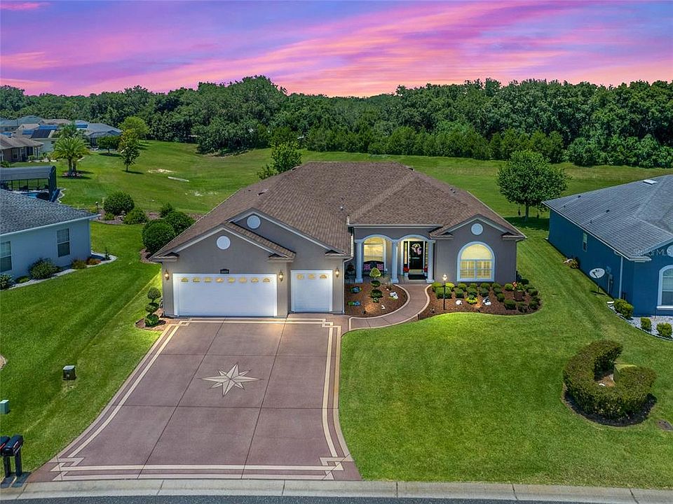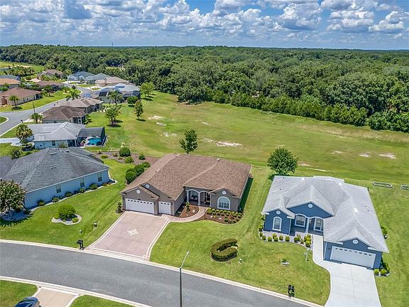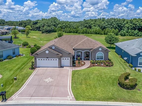 STONECREST 55+ GATE COMMUNITY WITH PRIVATE ROADS, 24 HOUR SECURITY, CHAMPIONSHIP GOLF COURSE WITH ALL THE AMENITIES AND POOLS. THE VILLAGES IS JUST A BRIDGE AWAY BY GOLF CART AND CHEERS RESTAURANT IS LOCATED IN THE COUNTRY CLUB. THIS CUSTOM DESIGN MODEL WITH 3 BEDROOMS AND 3 BATHROOMS WILL BLOW YOUR MIND! A 32 X 24 FOOT GARAGE WITH GOLF CART GARAGE CAN ACCOMMODATE A TRUCK WITH ROOM TO SPARE! LOCATED ON A LARGE AND SPACIOUS GREEN DRY POND, FIDO WILL LOVE TO RUN AND FETCH A BALL! NORTH/SOUTH EXPOSURE, AND ROOM FOR A POOL AND THE THIRD BATHROOM IS OFF THE LANAI WITH AN 8FT DOOR HAS A BLIND THAT IS INSET. THE OVERSIZED PAINTED DRIVEWAY. WALK WAY AND MANICURED LAWN GIVES YOU GREAT CURB APPEAL. ONCE YOU ENTER THE HOME YOUR JAW WILL DROP AT THE TASTEFUL ARCHWAY SEPARATION FOR FORMAL DINING ROOM AND LIVING ROOM WILL AMAZING COFFER CEILINGS. OPEN KITCHEN CONCEPT WITH A PLETHORA OF CABINETS FOR STORAGE. 42", 40" AND 30" CABINETS ABOUND WITH CROWN MOLDING AND GLASS INSERTS TO DISPLAY YOUR FAVORITE DISHES OR GLASSWARE. THERE IS A BREAKFAST BAR AS WELL AS A DINETTE AREA IN THE KITCHEN THAT NESTLES UP TO THE BAY WINDOW. THE GRANITE COUNTER TOPS GLISTEN ALONG WITH THE CONTINUOUS HIGH GLOSS FINISHED LAMINATE FLOORING. 10 FOOT CEILINGS THROUGHOUT THE HOME AND GARAGE AND LANAI. SPLIT BEDROOM CONCEPT WITH THE GUEST QUARTERS HAVING THE ABILITY OF BEING A SUITE. THE POCKET DOOR CLOSES OFF TO THE MAIN RESIDENCE AND THE EXPANSION OF THE ROOMS ALLOWS THE DESIGN OF THE APARTMENT STYLE EFFICIENCY (PERFECT FOR IN LAWS OR GUESTS) WITH ITS OWN REFRIGERATOR, SINK AND MICROWAVE AND COUNTERTOP STORAGE. WALK IN CLOSET AND A LOVELY VIEW TO THE OPEN AND SPACIOUS (AS WELL AS PRIVATE) BACK YARD. CROWN MOLDING FRAMES THE INTERIOR OF THE HOME. THE MASTER BEDROOM INSET GIVES A FORMAL APPROACH TO THE ROOM. HIS AND HER CLOSETS AS WELL AS HIS AND HER VANITIES AND A HUGE WALK IN SHOWER AND WATER CLOSET. PLANTATION SHUTTERS ADORN THE WINDOWS IN THE DINING ROOM AND FAMILY ROOM/DEN/OFFICE. THE FAMILY ROOM HAS FRENCH POCKET DOORS FOR ADDITIONAL PRIVACY. THE SCREENED LANAI FACES NORTH AND BECKONS YOU TO COME AND SIT AND STAY A WHILE. THIS HOME IS IDEAL FOR TWO SEPARATE FAMILIES OR THE ONE THAT LOVES TO ENTERTAIN IN STYLE AND LOVES EYE CANDY, AS THIS HOME HAS IT ALL! WE HAVE LOVINGLY NAMED THIS HOME CHRISTMAS IN JULY AND BELIEVE YOU TOO WILL FILL THE QUALITY AND LOVE IN THE DESIGN OF THIS HOME. WHAT A WONDERFUL GIFT TO GIVE YOURSELF AND SHARE WITH THOSE YOU LOVE! TRULY ONE OF A KIND AND A MUST SEE!