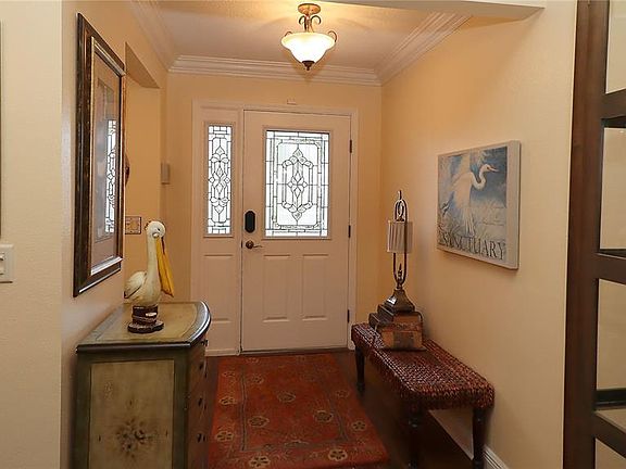 If you would like to live a short way away from the town square, this home may be for you. It is just a short drive to Sumter Landing, entertainment, music, shopping and dining. Golf courses are all around the Village of Largo ( Bogart and Bacall courses and the Bacall recreation center where you can take classes). This beautiful block and stucco 3/2 Jasmine designer is located in the Village of Largo and has so much to offer. First the street appeal is lovely with the trimmed hedges and trees, the cement textured driveway and walk way. As you enter through the leaded glass front door you will enjoy the beautiful hickory wood flooring in the dining, living, and kitchen. The kitchen has an eat in nook and new stainless appliances and the door to the double car garage (with enhanced lighting) is right off the kitchen. Vaulted ceilings and crown molding, and a solar tube grace the living room and dining room. Through the sliders you can enjoy the Florida Room which has its own HVAC, shades and a finished floor. There is also a door to the outdoor patio where you can put your grill or enjoy the Florida sunshine. As you come back into the center of the home you will see that it is a split floorplan with the Primary bedroom on the right. There are plantation shutters in this room as well as the rest of the home. Overhead fans are in every room. The Primary has a large custom walk-in closet. The Primary bath has double sinks and a soothing shower. On the opposite side of the home are two guest bedrooms both with closets and wood laminate flooring and plantation shutters. The guest bath has a tub/shower combo. This home has two HVAC units 2020, roof is 10 years old with architectural shingles. There is also a Termite warranty on this home which means it has been treated to keep termites away. Stop and see this unique home before its gone. Maint. $590.03, Bond annual pmt $1,608.96, Fire $320.71, Taxes $1,744.05