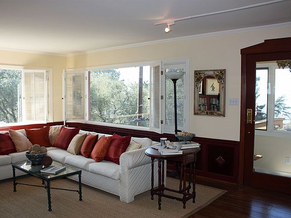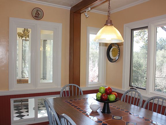 This Mid Century custom home has been lovingly maintained and updated by an artful hand craftsman. The upper entrance leads to the main living quarters. The living room has views, gorgeous custom wainscoting, with a decorative motif that repeats in the wood medallion set into the marble gas fireplace, and throughout the other rooms. The decorative motif appears beautifully inlaid into floors and cabinets. The dining alcove is bathed in sunlight and surrounded by windows. The kitchen is fully updated and features a copper hood, pass through to the family room , and skylight. A glass pocket door connects the kitchen to the laundry room. The family room features a wood burning fireplace and access to the yard. Two spacious bedrooms and an updated bath complete the upstairs. The lower entrance leads to a sunny separate two room guest suite with updated and beautifully tiled bath. The separate access to the guest suite allows for complete privacy which would make either a great home office away from home, or a private retreat for traveling family and friends to stay and relax. Conveniently located near the Berkeley Rose Garden , and Cragmont Park, this home is an hillside retreat dwellers delight.
