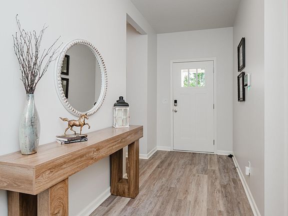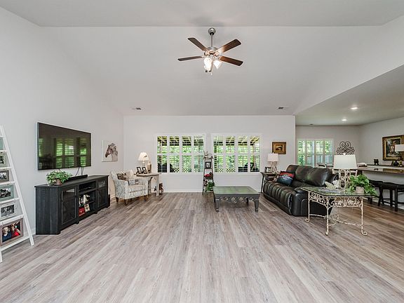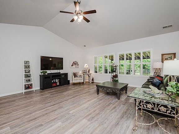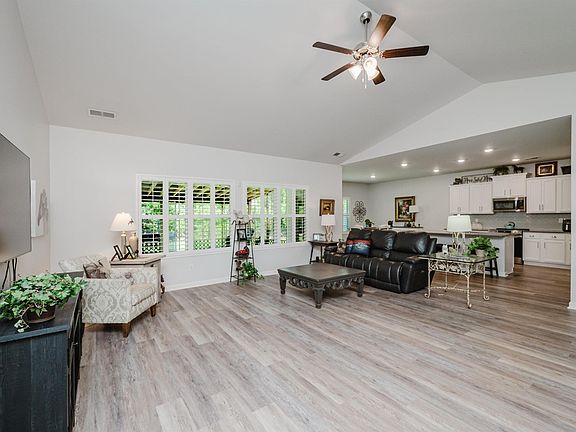 Fall in love with this beautiful 1 level home on flat lot. Backyard is fully fenced for your pets with tree lined privacy, wood and metal fencing and a big outside storage house to remain. New huge screened porch overlooking acres of woods to the back and a totally grassed lawn (great for entertaining) Outside lighting to remain. Split bedroom plan, open floorplan, super large great room, with vaulted ceiling, oversized island in the kitchen with eating space, coffee bar, large pantry and quartz countertops. LVP flooring throughout the home. Tile in the bathrooms. Laundry room with wash sink and ample storage. Master bedroom with tray ceiling - master bath features a soaking tub and separate shower and custom designed walk in closet. New exterior and interior paint. The neighborhood is circular with one way in and out -low traffic. Floor plan is awesome!. Lot is roomy and flat! Plantation Shutters!