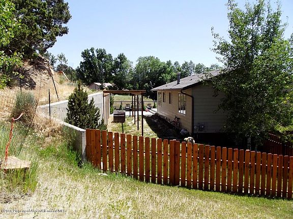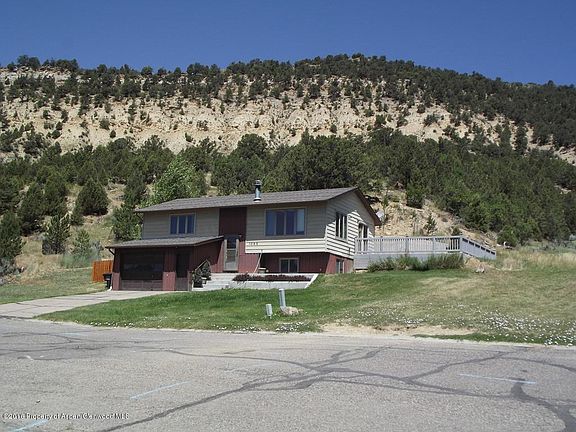 Over one acre of property on the north edge of Meeker with awesome views overlooking town and the countryside to the south, east and west.The bi-level home has 2 bedrooms and one full bathroom on the upper, main level, the living room, dining room and kitchen. The lower, walk-out basement level has one bedroom, the laundry and utility room, a nice family room, and a newly remodeled 3/4 bathroom. Plus the over-sized one car garage. The family room has a wood burning fireplace. From the dining room a sliding glass patio door opens onto a large Trex deck and the fenced back yard.Gas hot water heat, steel siding, the asphalt shingle roof was new in 2008.Part of the property is a 19,978 square foot separate buildable lot with a sewer tap. Great hiking on this property and above it.