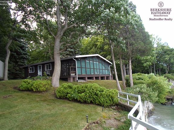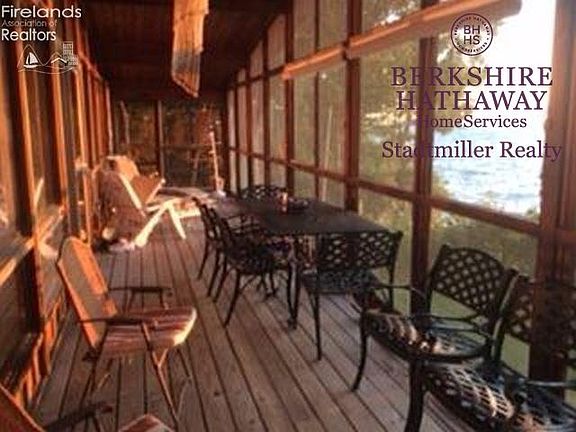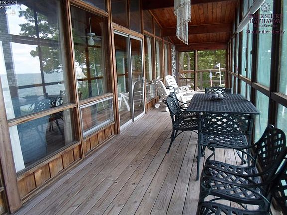 Lakefront home with beautiful views of sailboats and sunsets. Fully furnished, just move in. Sun porch is 38 x 8. Open floor plan, brick fireplace. Beach area with a cave area. Second bath and laundry are in the basement. 4-car garage with workshop area. Central air unit plus a window a/c in kitchen dining area.
