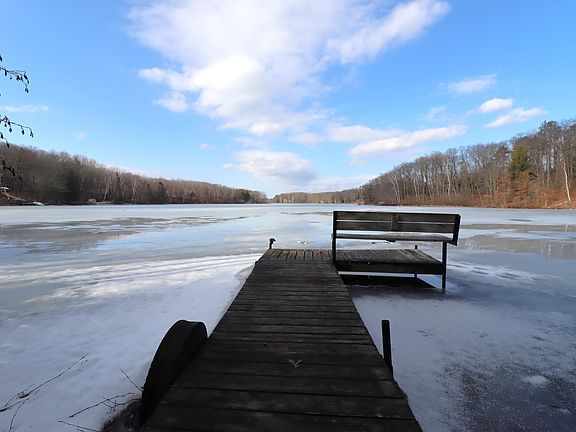 Absolutely charming and delightful lake home on the Pike Lake Chain! Set on over 2.5+/- acres with two docks on Flynn Lake this home and property abounds with hygge, comfort & character for truly lovely lake living. A warm welcome invites with living room stone fireplace, dining area, kitchen and stunning den that opens onto a spacious deck overlooking the lake. Primary bedroom w/en suite bath, massive walk-in closet and private deck overlooking the lake. Full partially finished lower level with full bath and walk-out gives you the option for even more living space. Imagine days spent in the water and nights by the bonfire. On the border of Delta and Iron River the scenic ride in is gorgeous. Beautifully landscaped with a detached garage complete this special place ready for you to call home. Aerial with yellow outline is an estimation based off of the survey.