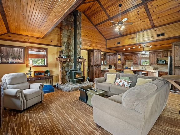 Beautiful cabin living on 5 acres mol in country setting not far from town! This home features a rustic charm starting when you walk through the door! Chef's kitchen with dark stained wood cabinets, granite countertops, island with step up bar seating, open concept to the living room that features stone hearth that extends to ceiling behind the freestanding wood stove. Cathedral ceilings in living room opening into the loft area (currently used as home office space) that looks over living & kitchen. Upstairs features bedroom #3 closed off from loft area. Downstairs includes main and 2nd bedrooms along with en-suite main bathroom with custom features of built-in soaking tub, walk-in shower with rock surround, and large walk-in closet. Detached 30x60 shop includes two garage doors, insulated walls w/osb, and plenty of space for projects or storage! New well pump. 6 minute drive to downtown Pea Ridge.