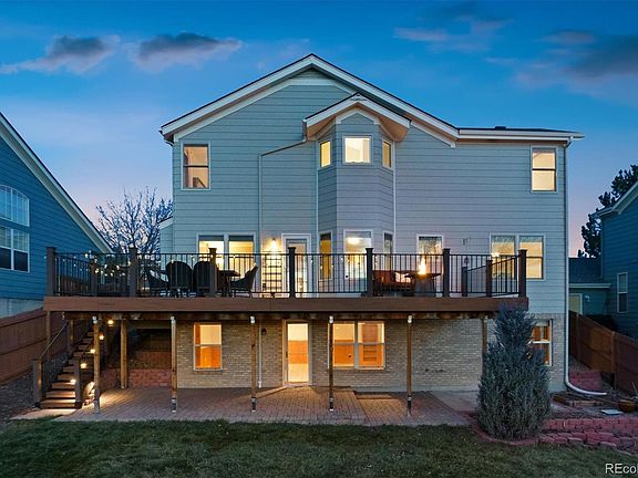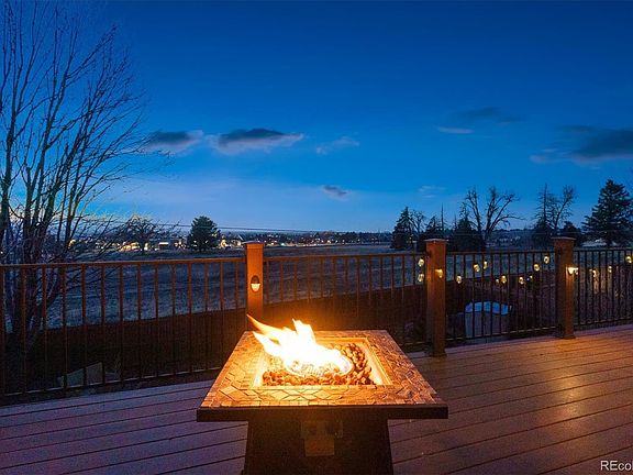 Upstairs, the primary suite impresses with double doors, vaulted ceilings, fresh paint, and a spa-like 5-piece ensuite bath with a soaking tub, tile floors, and a walk-in closet. Two additional bedrooms and a versatile loft provide flexible space for work, relaxation, or play. The finished walkout basement extends your living area, featuring a recreation space, a fourth bedroom, and a ¾ bath, with direct access to a covered patio designed to stay dry year-round. Step outside to enjoy the views from the expansive deck—perfect for morning coffee or watching those Colorado sunsets and city lights. The spacious backyard offers endless opportunities for outdoor fun and entertaining. Additional features include Anderson windows, central air, an intercom system, and ceiling fans. Ideally located near walking trails, parks, schools, restaurants, and entertainment, with an easy commute to the airport, Denver, and the Tech Center, this home offers the perfect combination of comfort, style.