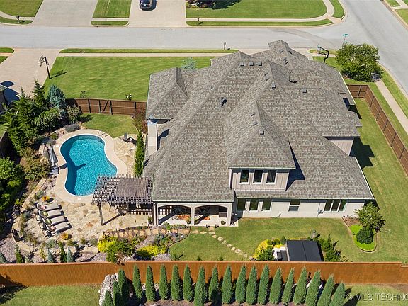 WELCOME HOME // Luxury Living in Bixby's Legends. Spacious five bedroom home on a large corner lot with INCREDIBLE outdoor living spaces, gardens, a heated saltwater pool (with heater/cooling unit) and over $150,000 in updates and upgrades. Enjoy entertaining and everyday living in the peaceful backyard haven that includes a full outdoor kitchen, covered outdoor living/dining area and an open air courtyard with a fireplace. Fantastic floor plan boasts a sleek study, formal dining room, living room open to updated eat-in kitchen, large laundry, primary suite, half bath, mudroom with drop zone cubbies, second bedroom with ensuite bathroom and a FamilySafe safe room on the main floor; game room with wet bar and home theater, three spacious bedrooms each with walk-in closets and ensuite bathrooms located upstairs. Fantastic storage throughout. Notable updates include: brand-new roof and gutters, new pool liner, new pool salt generator, luxury hot tub, extended flagstone patio with extensive landscaping, new fence, fresh interior paint, and all new designer light fixtures. The Legends is a master planned luxury community with HOA maintained greenbelts, ponds, a community pool, clubhouse and park. The home's ideal location in Bixby North schools provides quick access to dining, shopping, entertainment, highways and more.