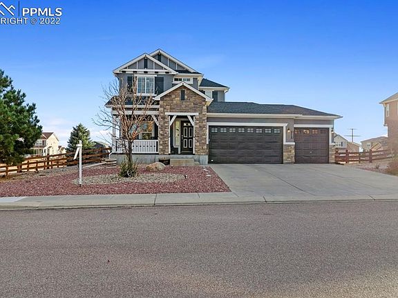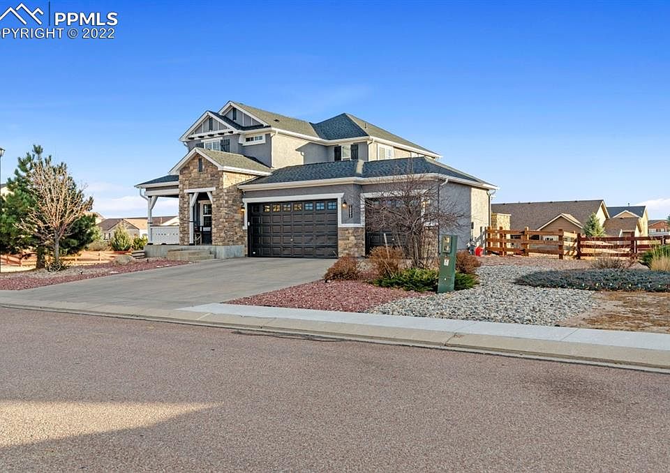 Beautiful 5 bedroom, 3.5 bath, 3 car garage Stucco home on a 1/4 acre corner lot. Landscaping finished w/front porch, side patio w/gorgeous exterior gas fireplace & extended back patio. Main level features Living Room, Modern kitchen with granite island and countertops, Lots of cabinets and Samsung appliances. Main floor also has office, 1/2 bath and laundry room. Basement is complete w/large family room & two bedrooms w/walk in closets and a full bathroom. Ask about the seller's allowance. The 5th bedroom is currently being used as a workshop. New roof just installed. Close to shopping and easy access to Woodmen Rd and Hwy 24.