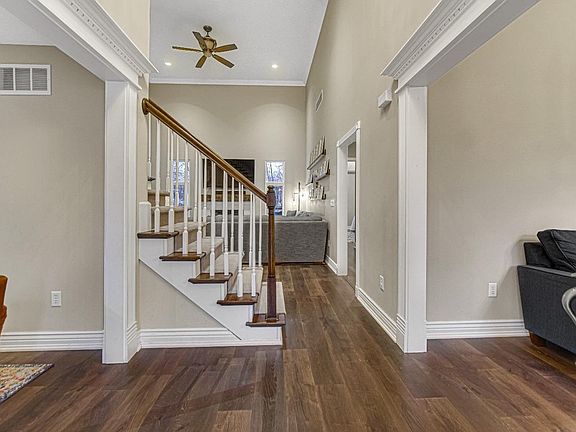 Welcome Home to this inviting 2 Story boasting 4 Bedrooms, 2.5 Baths, Enormous 20 ft Cathedral Ceilings in the Great Room, an Electric Fireplace, New Lighting fixtures, & Engineered Hardwood Flooring throughout the Main level. Many flex-spaces exist here including a Library with custom built-in shelving, a Formal Dining Room currently used as a Den, Breakfast area, and a Completely Remodeled Kitchen with Stainless Appliance Package, New Cabinetry, and Quartz Countertops. The Main Floor Owner's Suite has a large Walk-in Closet, Jetted tub with separate Shower, and a Patio door leading to the huge 27 x 20 wood deck. On the Upper level you will find 3 additional Bedrooms, another full Bath, plus a Bonus Attic Space perfect for storage or future expansion. Additional recent updates include: New Furnace & A/C (2018) New Windows throughout (2017) Professionally Water-proofed Crawl w/ commercial dehumidifier + added sump installed by Nova (2017) 18kw Generac Generator (2022) & Blink Cameras